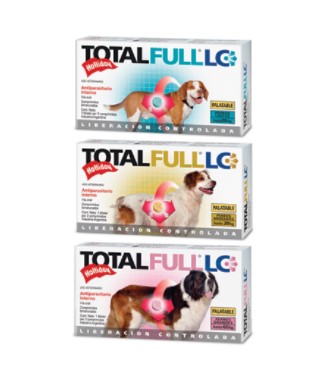 Total Full LC perros grandes: Envase conteniendo 1 blister por 3 comprimidos birranurados palatables para perros hasta 60 kg.